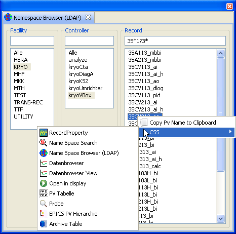 The namespace browser is available in two variations. One requires the same LDAP-Server as the namespace-search-tool and the other builds directly on the TINE protocol. The handling of both versions is equal. Pro level, a list of all items is displayed, it can be limited by a search pattern. If an item is selected, the corresponding elements in the next few levels are displayed.