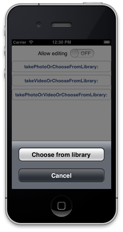 - Create action sheet with appropriate options ("Take Photo" or "Choose from Library"), as available