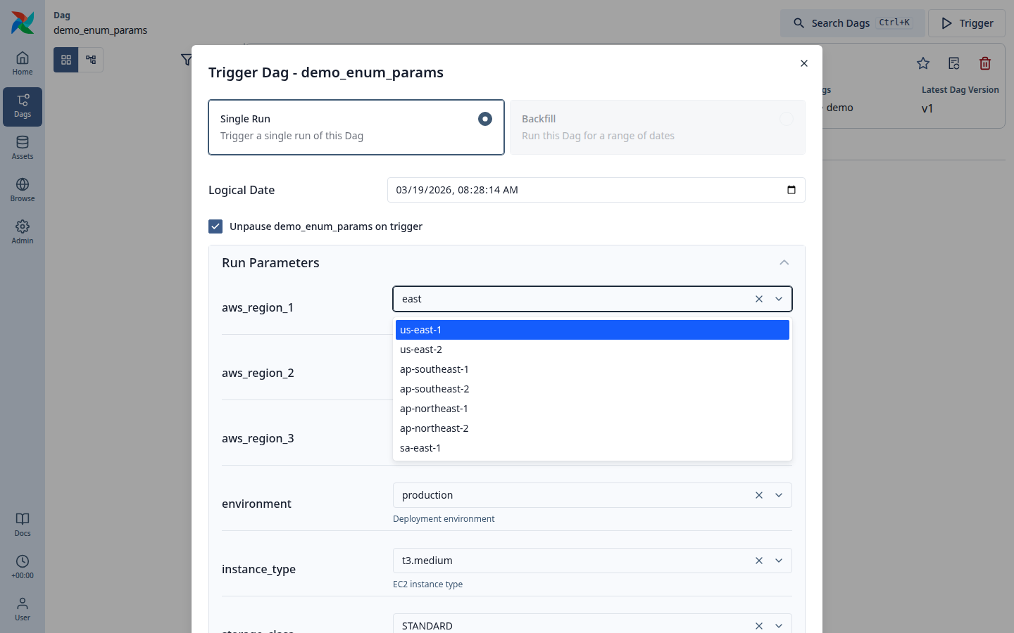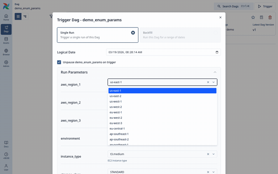 Here are some screenshots from running the fix locally on a DAG with 12 enum params. Clicking the field opens the full list: Typing filters it down in real time — here searching "east" narrows it to the matching regions: All 12 params render as searchable dropdowns. String, integer, and other param types are unaffected since the change only applies when |