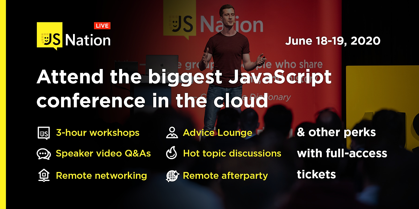 Would you like to know the future of the JavaScript ecosystem and get connected to a stellar crowd? To help you stay up-to-date on the latest JS tech, the GitNation team has come up with a new remote event taking place on June 18-19, 2020. JSNation Live, their 2-day event on all things JavaScript, will gather 25 thousand software engineers, making it the biggest JavaScript conference in the cloud.