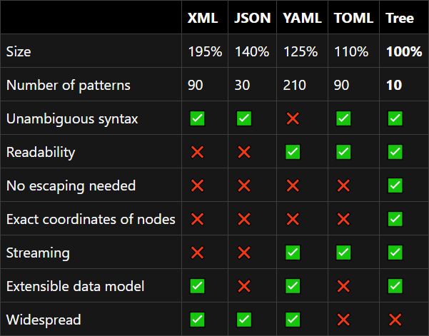 XML, JSON, TOML, YAML are bad relative to Tree data format