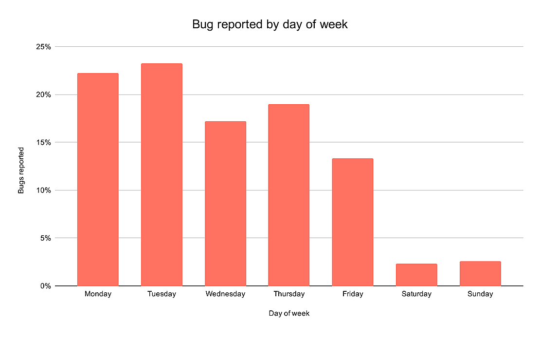 When do people report bugs? You probably never asked yourself that question, which was one of the reasons we wanted to answer it. The second reason was that we had the right type of data available, since our tool helps teams report and fix bugs. Long story short, we decided to learn more about the way software development teams approach the bug reporting process. For that exercise we've taken a random sample of 3000 bug recordings uploaded to our database in the last 2 months. Here's what we found.