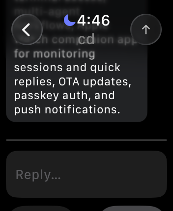 Full mobile support with biometric auth and push notifications. Shell sessions allow interactive keyboard input on mobile (SSH-like). Sub-session preview cards always show latest messages. Toast notifications navigate directly to the relevant session. Apple Watch support adds quick session monitoring, unread counts, and quick replies from the wrist.