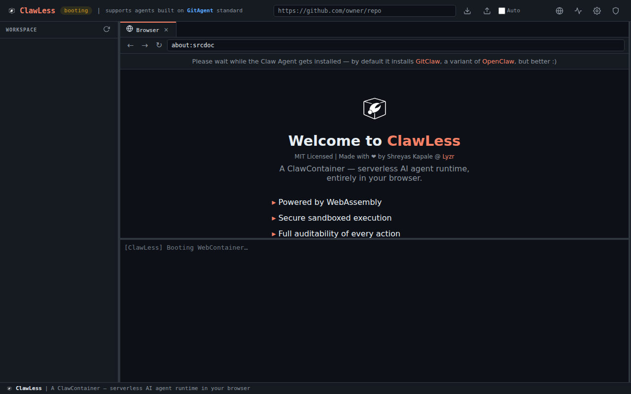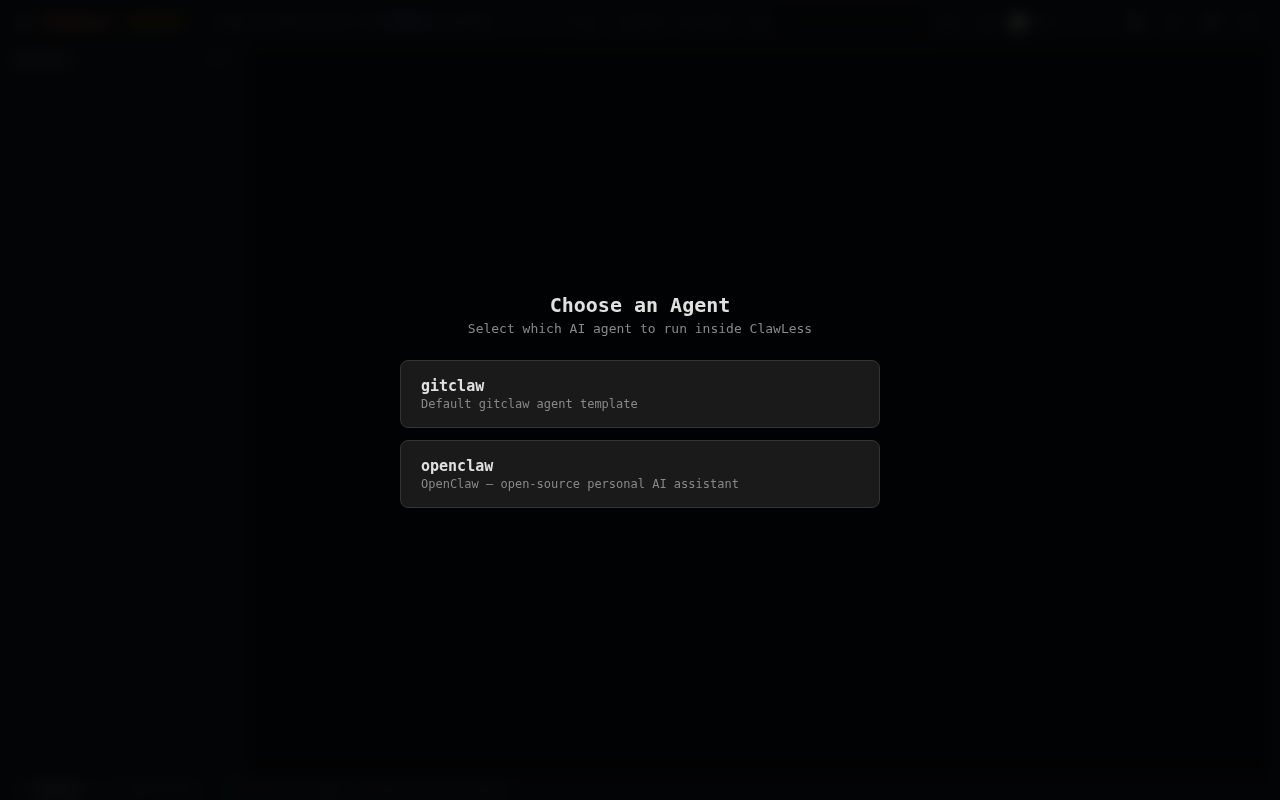 ClawLess hardcodes GitClaw as the only agent — buildContainerPackageJson pins gitclaw: '1.1.4', buildWorkspaceFiles always mounts GitClaw config files, and sdk.ts branches on isGitclaw. This blocks #4 (OpenClaw support) because there's no way to register and boot a different agent.