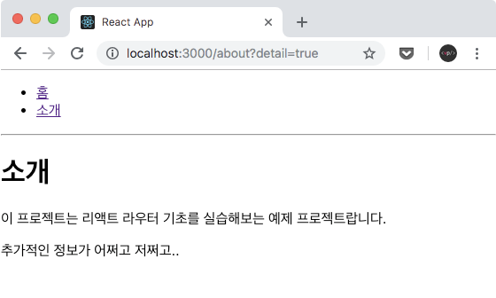 $ yarn add qs이제, About 컴포넌트에서 search 값에있는 detail 값을 받아와서, 해당 값이 true 일때 추가정보를 보여주도록 구현을 해보겠습니다.